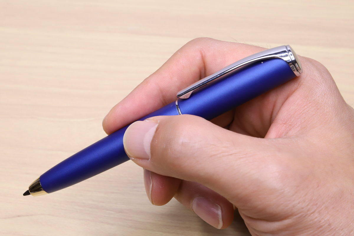試しにほどよくバランスの取れる部分を探っていくと、おそらく上写真のような持ち方になるはず。この持ち位置は先端が長くなる=移動量が大きくなるため、大きい字が書きやすいのだ。