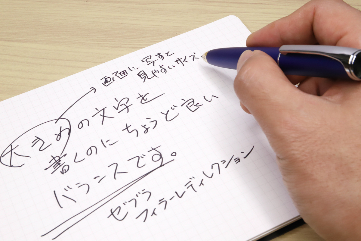 例えば書類に指示書きをする場合でも、サインペンで太い文字を書いた方が伝わりやすいのは明らか。小さな文字をチマチマ書いていたら読み飛ばされるかもしれないし、なによりも長い文章は誤読の危険性もある。短いワードを大きくグイッと、が重要というわけ。もちろん、ビデオ会議でノートやスケッチブックに図を書いて見せるなどにも、太い線と大きい字の方が良いのは簡単に想像できるだろう。