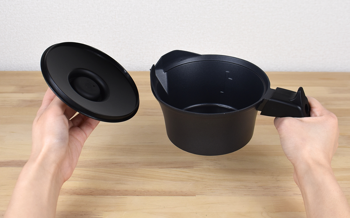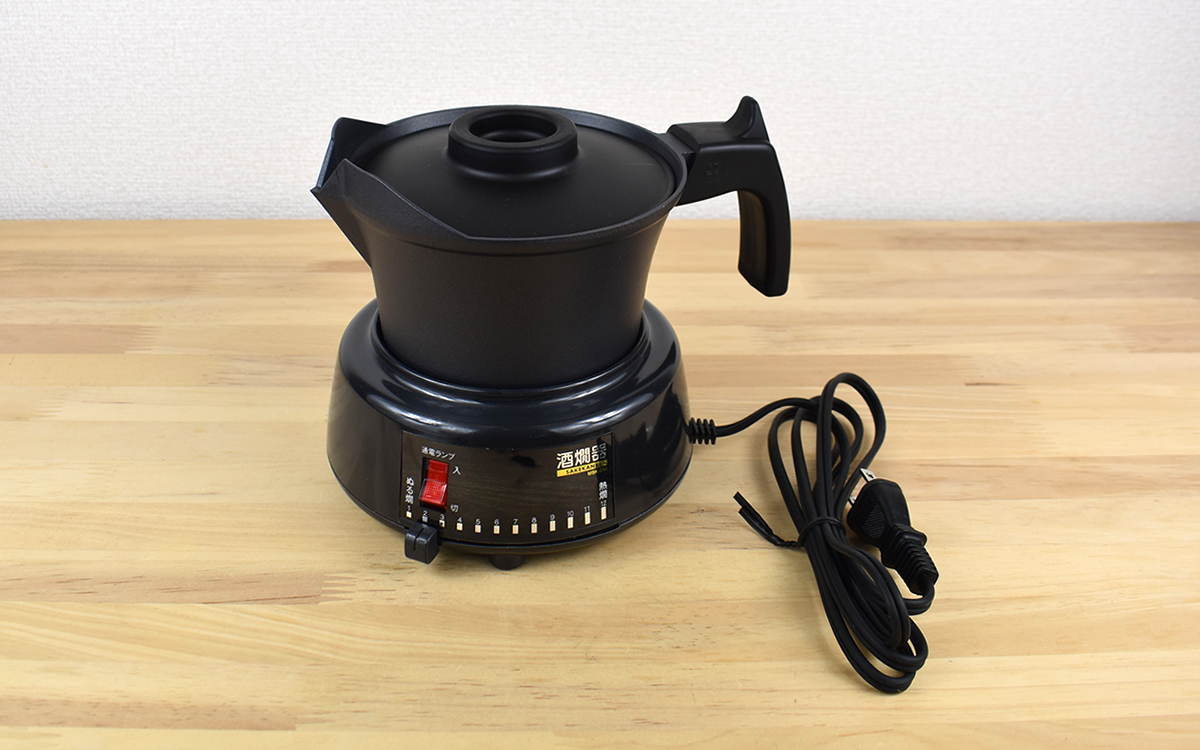 温度調節つまみを備えた本体と、ハンドル・ふたのついた徳利がセットになった同商品。徳利の内側には水位計が刻まれていて、それぞれの高さは1.0合(約180ml)、2.0合(約360ml)、2.5合(約450ml)を示しています。