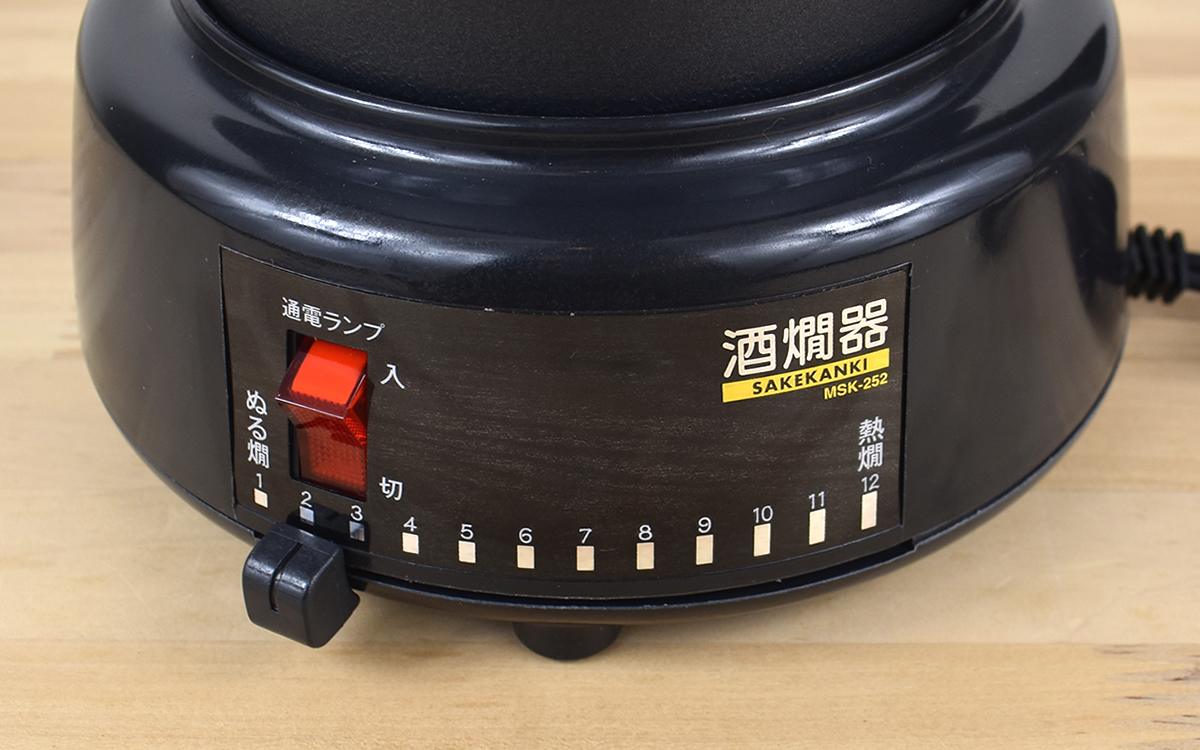 本体を手にして驚いたのは、温度を12段階も調節できること。つまみのそばに1~12までの数字が割り振られ、1の上に「ぬる燗」、12のところには「熱燗」という表記が。つまみを動かして簡単に設定できるため、ガスコンロと比べて面倒な手順を踏まずに済むのが大きな利点です。