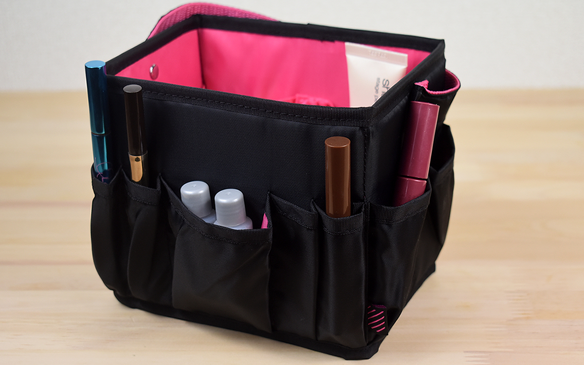 持ち手を除いた立体時のサイズは170(幅)×140(高さ)×130mm(奥行)。外観はコンパクトに見えますが、コスメグッズなどを入れてみてびっくり。ご覧のとおり十分すぎるほどの空間があり、内ポケットや付属の面ファスナーつき仕切り板を使うことで様々な形状のアイテムを収納することができました。