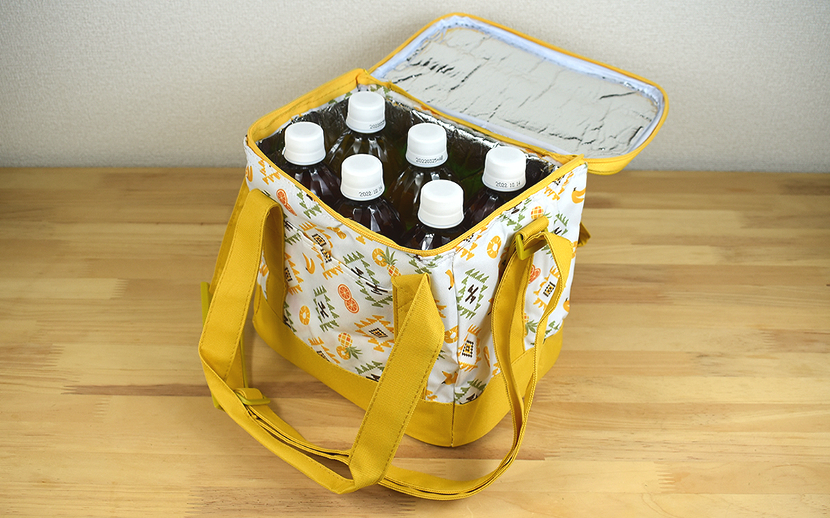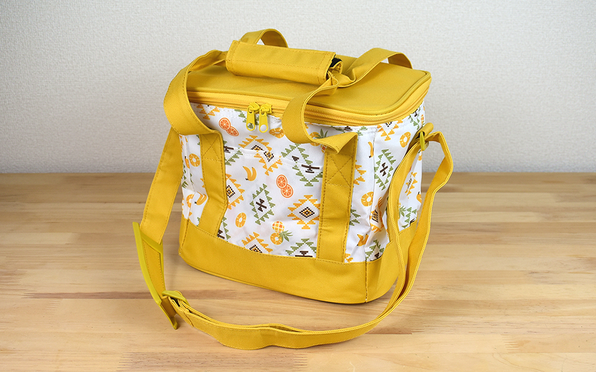 本体サイズは約25(幅)×17(奥行)×22cm(高さ)で、耐荷重は約8kg。イエローとグリーンを基調としたポップなフルーツ柄は、パイナップル・バナナ・アボカドなどのイラストがちりばめられています。裏地は銀色のアルミ蒸着シートが使われており、保冷剤を使用する際は150g×2個を目安にしてくださいね。