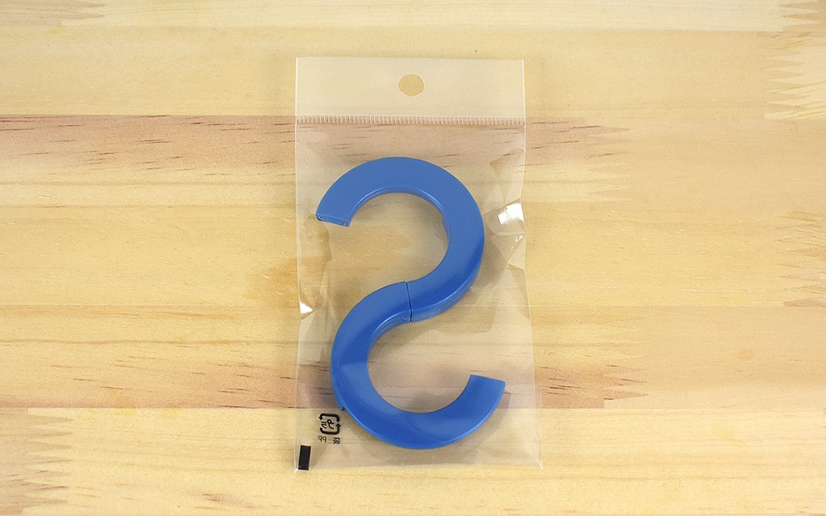 本体サイズは約50(幅)×90mm(長さ)。金属でできた細い棒状のS字フックとは異なり、ポリアセタールという樹脂でできた厚みのあるデザインが特徴です。5色のカラーバリエーションから、今回はブルーをセレクトしました。