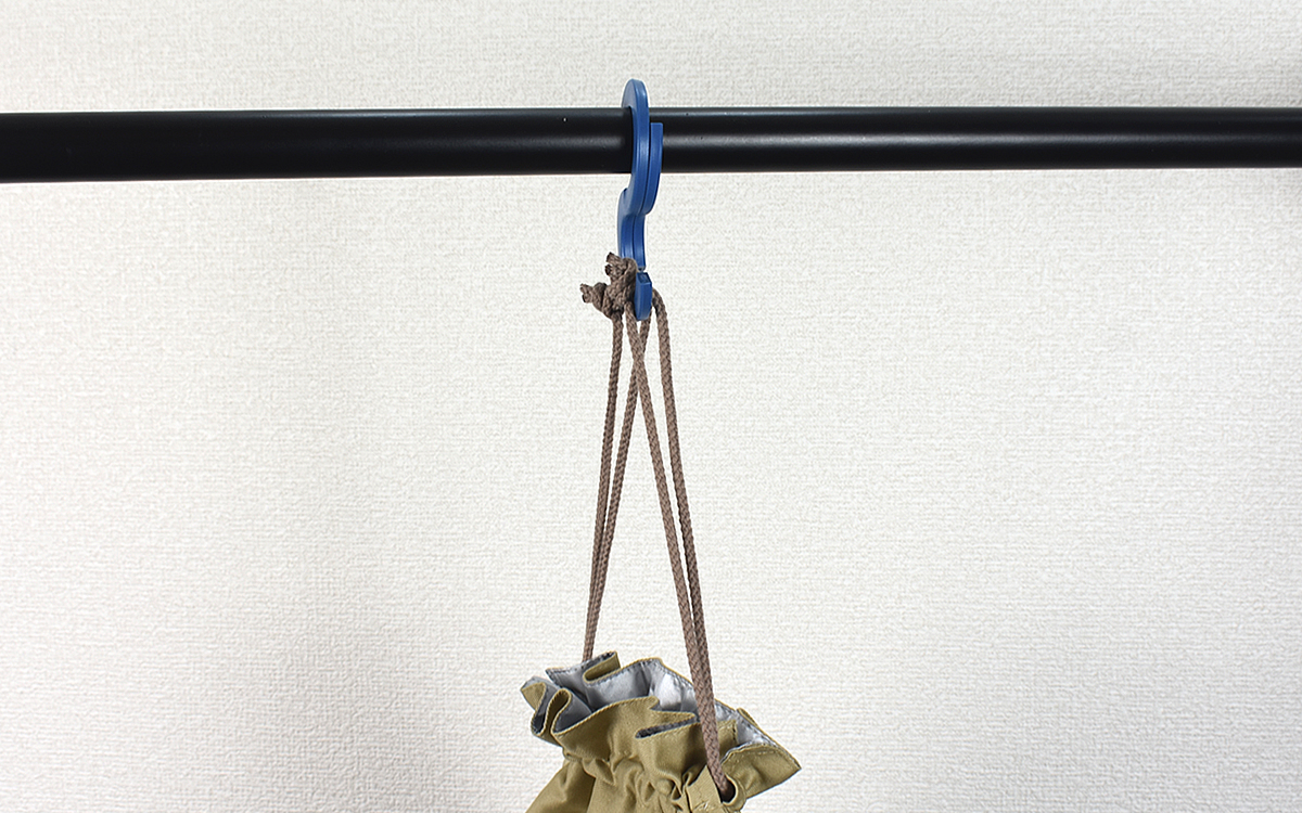 フックとして引っ掛けるのではなく、物が落ちないように吊り下げたいという時はO字型にして荷物を通すのがオススメ。旅行の時はバッグをスーツケースに固定することもできます。また小さいポーチなどバラバラになりがちな小物同士を一緒に取り付けて、カラビナのように使うことも可能。ちなみにS字型に戻す際は、側面についている目印部分から簡単に開閉できました。