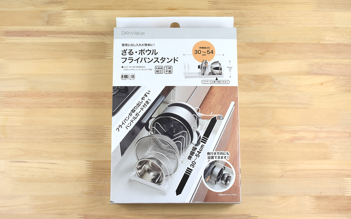 毎日のように使用する鍋やフライパンなどの調理器具。数が増えれば増えるほど管理が大変になり、片づけも一苦労です。さらに省スペース化を図るあまり、重ねて収納した調理器具から目当てのものを取り出す際に手こずることも…。そんな問題を解消すべく今回購入したのが、「伸縮ざるボウルフライパンスタンド」(1290円/税込)というキッチングッズ。一体どのように使用するのでしょうか。