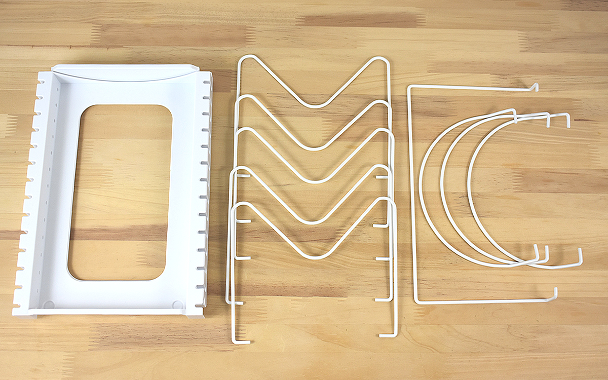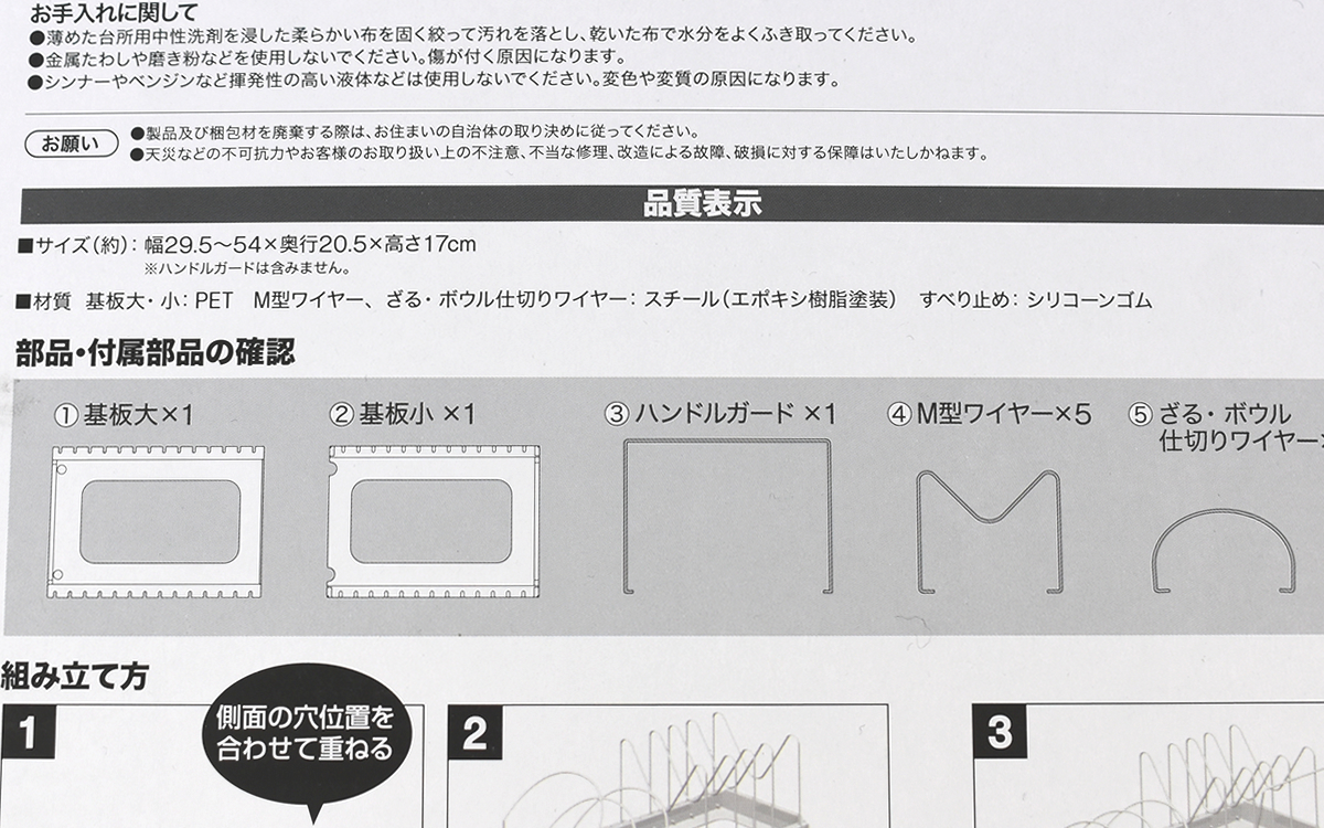 基板(大・小1枚ずつ)、ハンドルガード1本、M字ワイヤー5本、ざる・ボウル仕切りワイヤー3本がセットになった同商品。これだけパーツがあると「組み立てが大変そう」と感じるかもしれませんが、基板を重ねたらあとはワイヤーの先端を側面の穴に差しこむだけなのでご安心を。