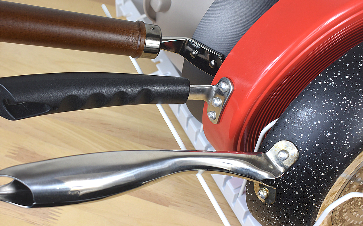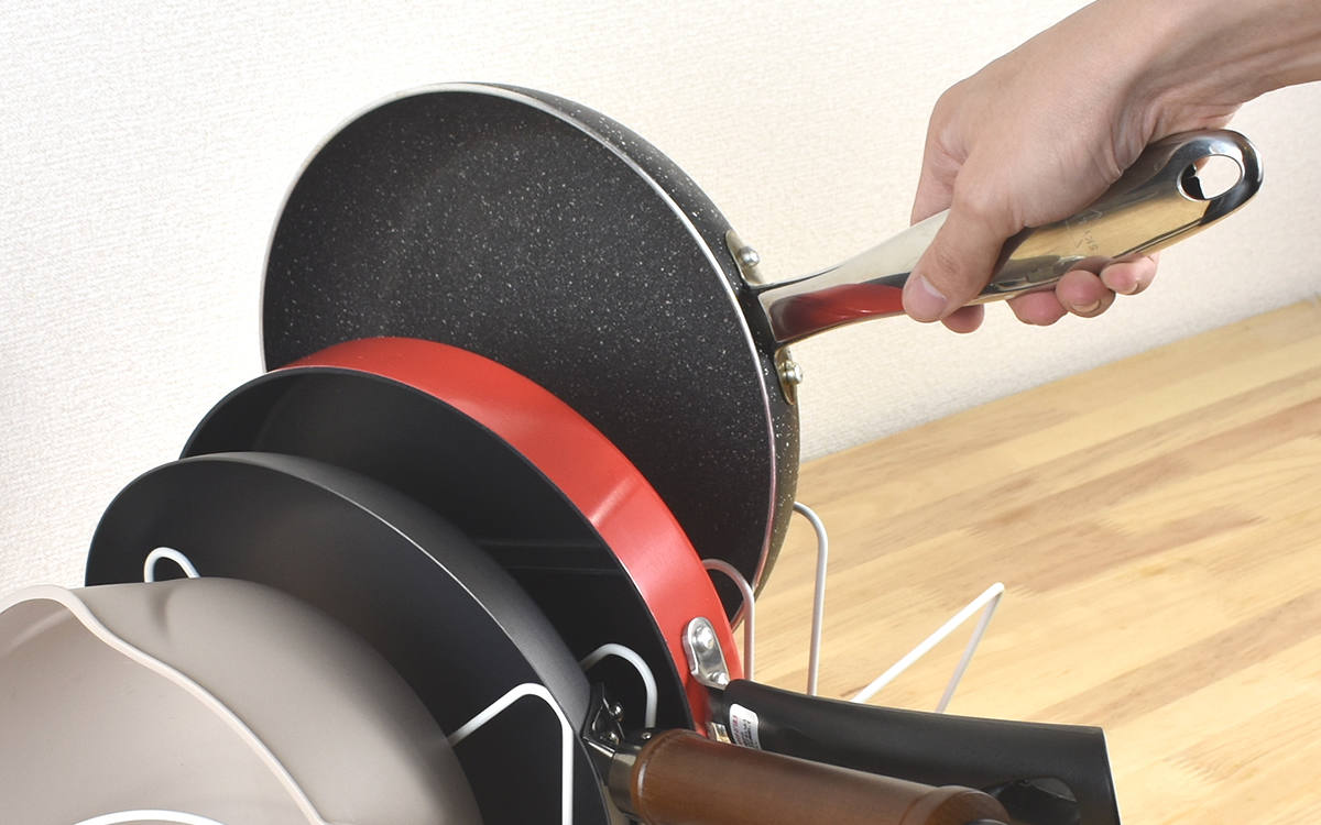 実際にフライパンや鍋を収納してみたところ、普段はかさばりがちな調理器具が見事にすっきり。“重ねる”のではなく“並べて置く”ことによって出し入れしやすいのもポイントです。また、基板に取りつけたハンドルガードが大活躍。フライパン・鍋のハンドルを上向きに支えるため、奥まで手を入れる手間なくサっと取っ手を掴めました。