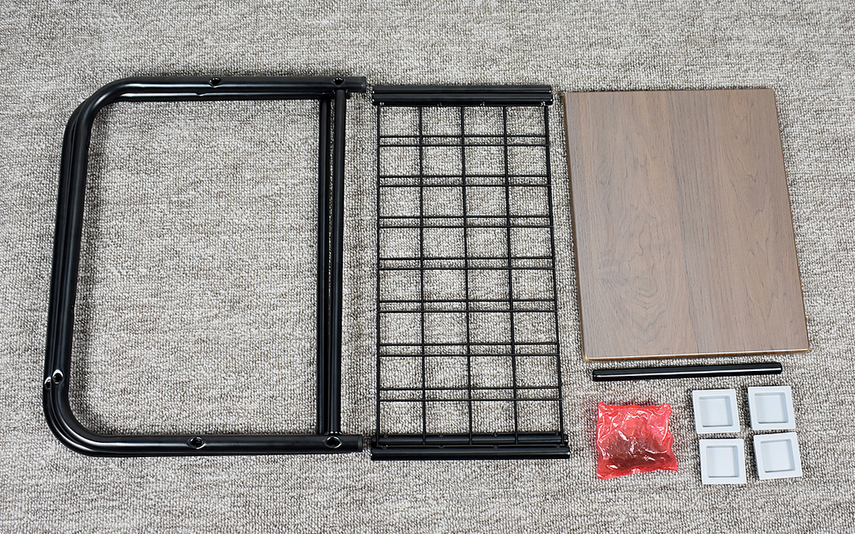 パッケージから取り出したのは、天板や金属製メッシュなどの各パーツ。組み立てが必要になる商品ですが、ネジと六角レンチもセットになっているので、安全用の手袋以外に用意するものはありません。