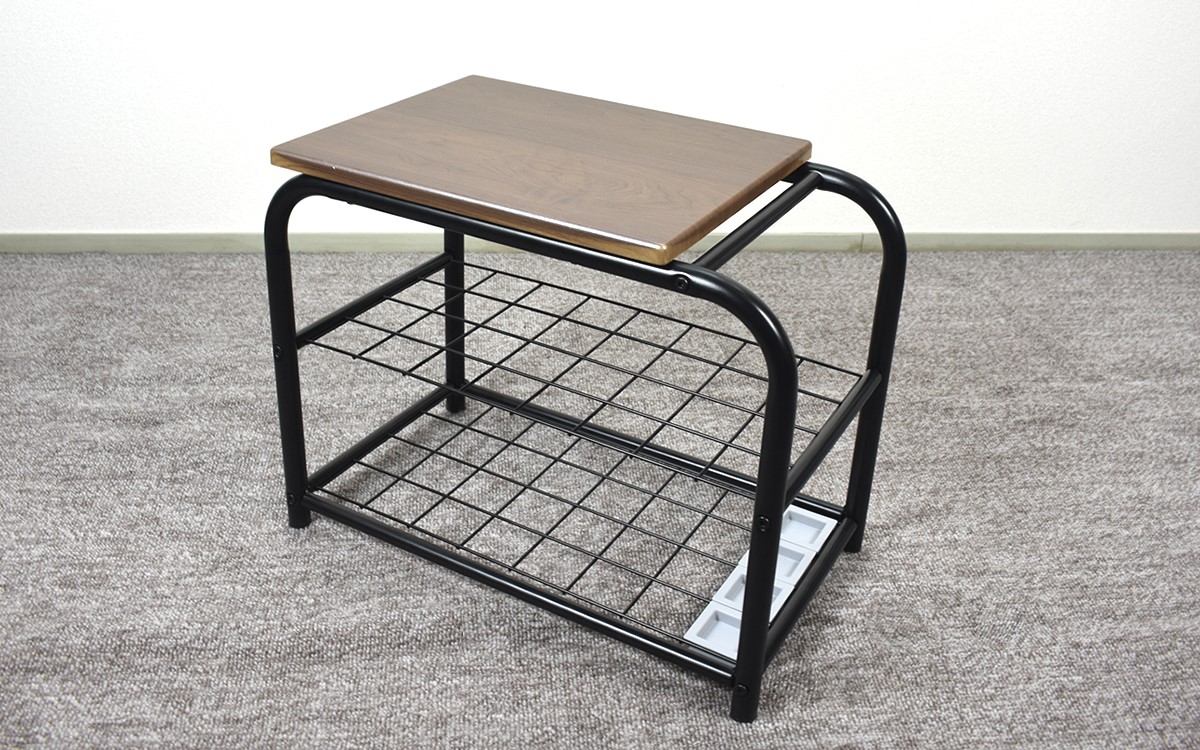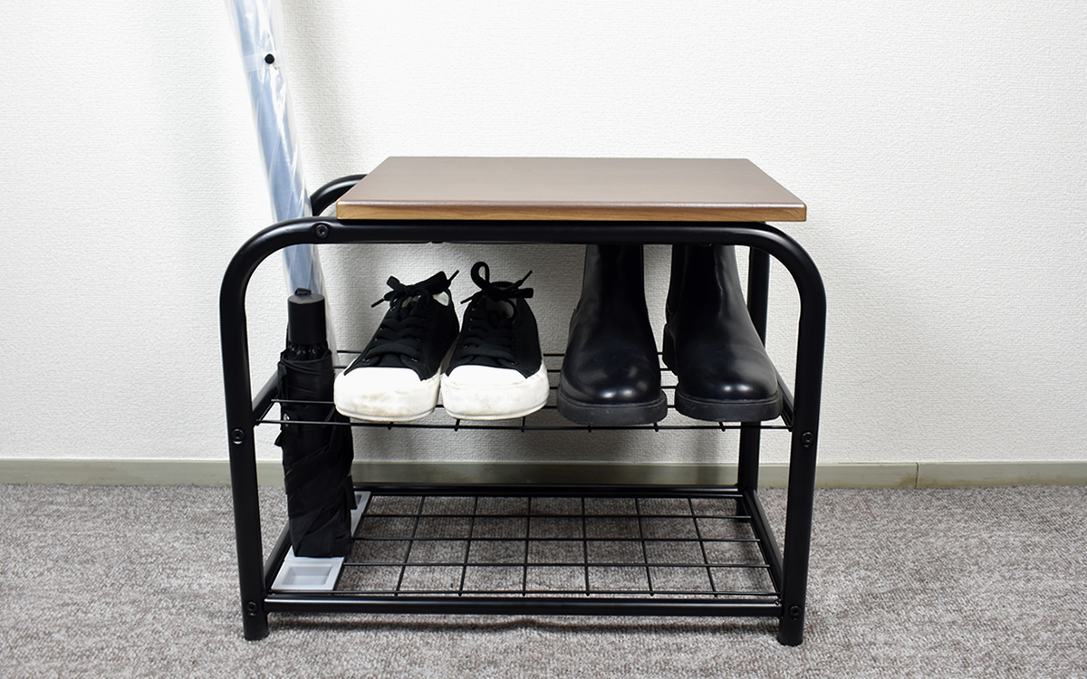 組み立て後のサイズは51(幅)×29.2(奥行)×40.3cm(高さ)で、靴は下段・中段に計4足収納することが可能。その横の傘立て部分には受け皿が取りつけられるので、床を濡らさずに済みますよ。