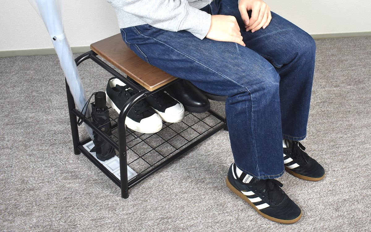 実際に使用してみて「これは便利」と関心したのが、ベンチとしての役割。靴を取り出してから無理に屈んだり腰をひねる手間がなく、そのまま腰かけて少し前傾姿勢になるだけでサっと履くことができました。約3.4kgとそれなりに重量があるため、腰を下ろしていても安定感は問題ナシ。ベンチを使わない時は、外出用のカバン置きなどに活用できるのもポイントです。