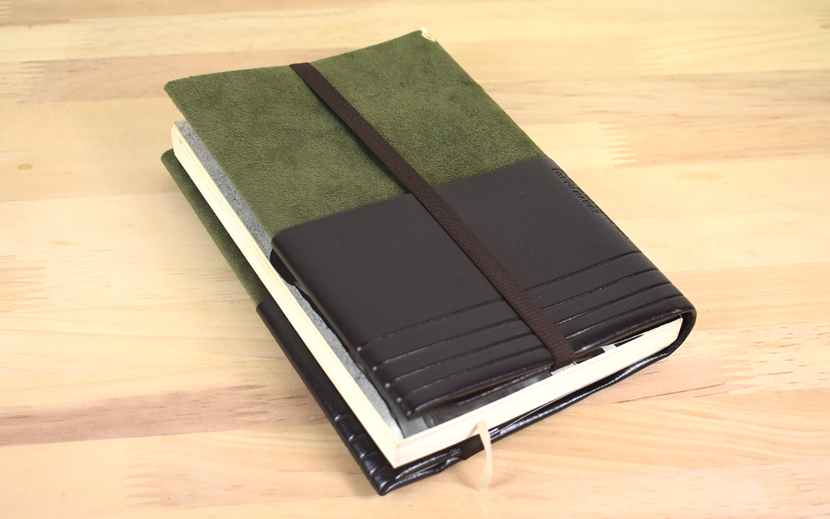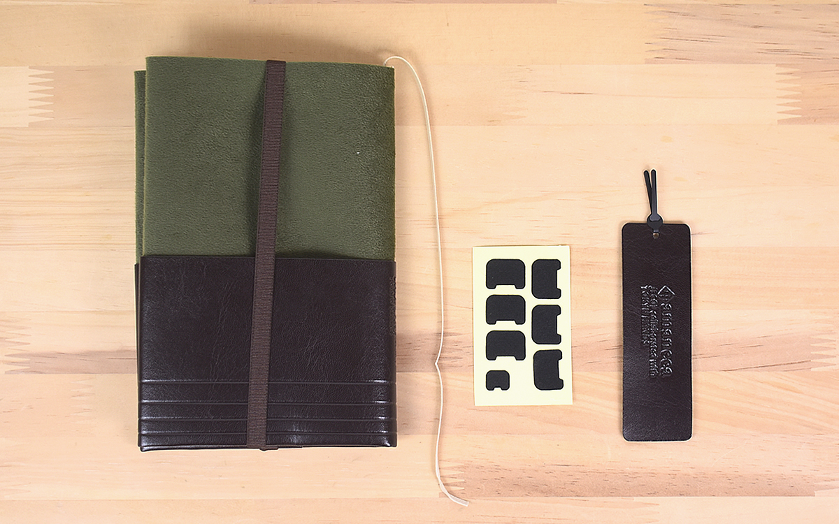 ブックカバー本体の他に、金具カバーシールと栞がセットになった同商品。スエード調の生地と合皮が手ざわりのよさを感じさせてくれますが、なにより驚かされるのは文庫からA5判・菊判サイズまでカバーできるという点です。