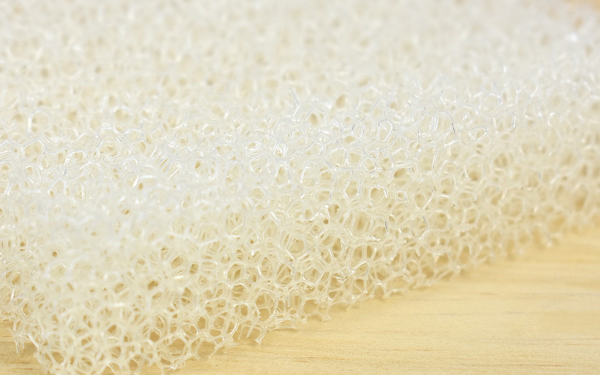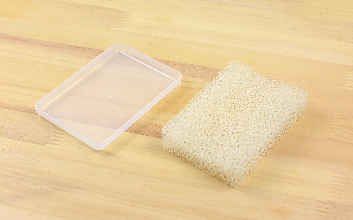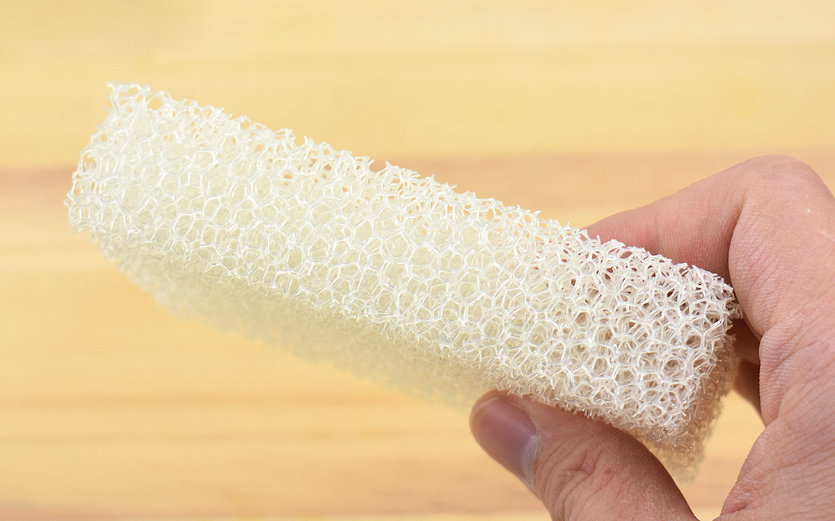 スポンジを手にして、おそらく誰もがその手ざわりに驚かされるのではないでしょうか。ポリウレタンを素材にしたスポンジの見た目は、細かい目の開いた乾燥ヘチマにそっくり。やわらかそうな見た目によらず、ごわごわした硬質な感触が指先に伝わってきます。