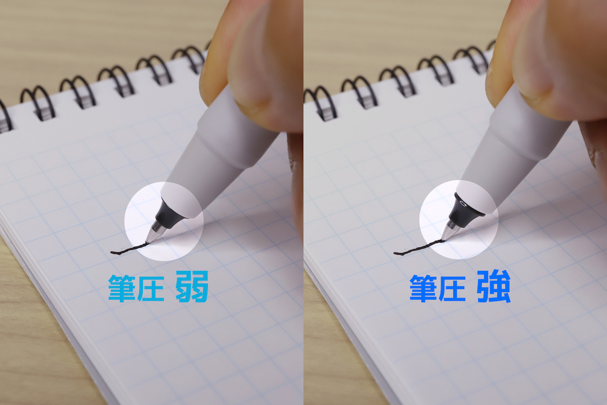 言葉で説明するだけでは分かりづらい「筆圧の加減」も、動画ならたしかに分かりやすい。筆圧のかかり具合が先端パーツの動きで可視化されているのも、大きなポイントだ。