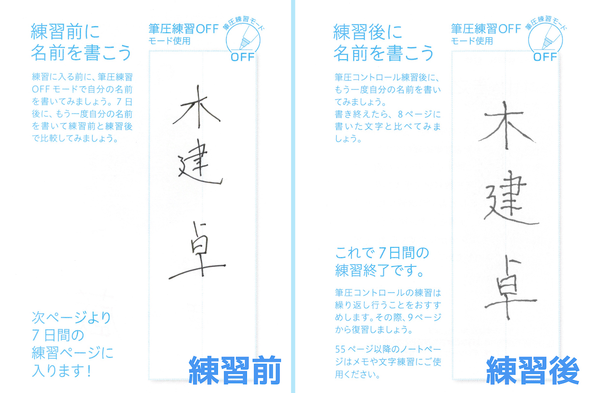 1日の練習前には、まず筆圧オフモードで課題文字を書くのだが、それを筆圧コントロールして書いた練習後の文字と比較すると、なかなか面白い。