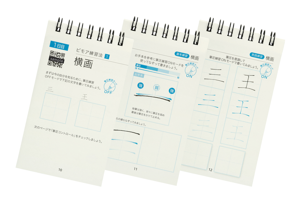 もう一方のメモ帳タイプ練習帳は、筆圧を意識しつつなぞり書きをする、というのがメイン。7日分に分割された課題ごとにQRコードが印刷されており、スマホで読むことで、書家・美文字研究家である青山浩之氏監修の練習動画が観られるようになっている。