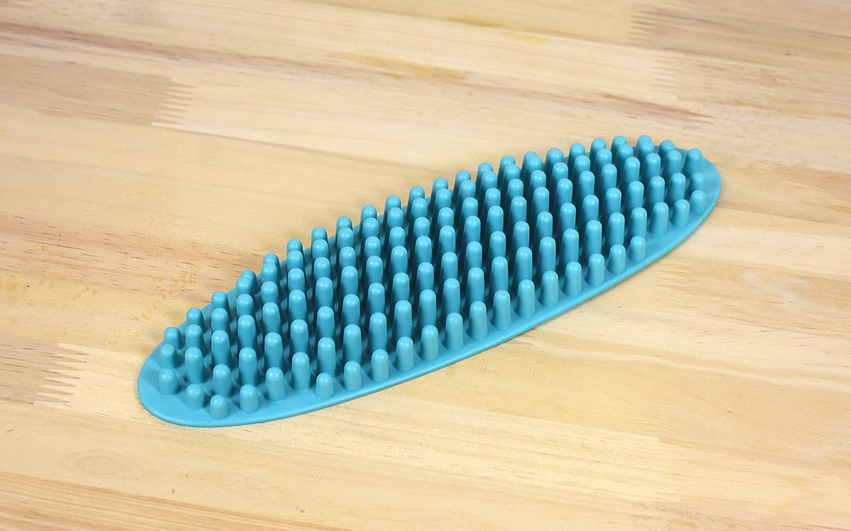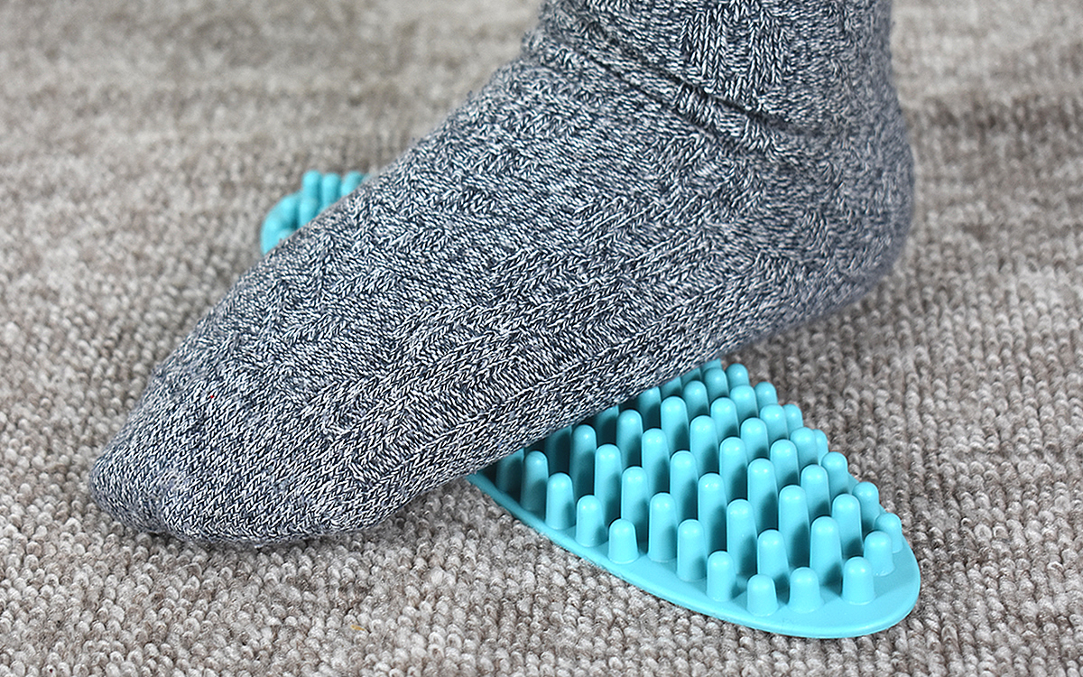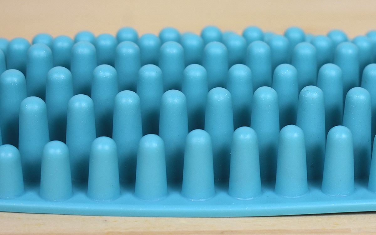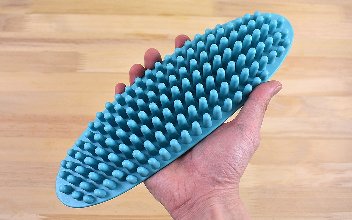 エラストマー製で柔軟性がありつつ、びっしりと並んだ突起はツボ押しに十分な強度。高さは場所によって異なり、外側から中央に向かうほど背が高くなっています。