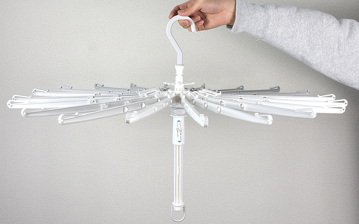 冬場の洗濯は基本室内干しが多い私。部屋干し用の大きなハンガーを使っているものの、かさばる分、使用後の置き場所には困ってしまいます…。もっとコンパクトなハンガーはないかと悩んでいた時、ニトリで見つけたのが「室内・外干し用パラソルハンガー(ミル)」(1017円/税込)でした。