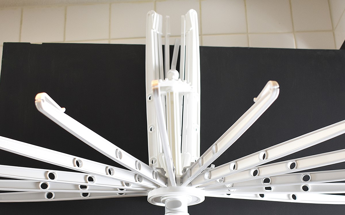 大きさ約78(幅)×78(奥行)×51cm(高さ)のハンガーは、アームが20本ついていて洗濯物をたっぷり干すことが可能。使用しない時はアームを縦に折り畳んでコンパクトに収納できます。上部にはフックに引っかけられるパーツがついており、壁かけ収納に対応。狭い部屋でも置き場所に不自由しません。