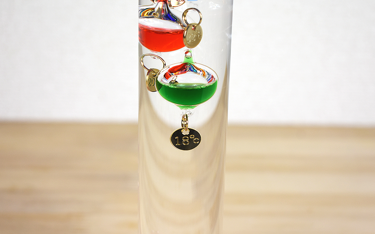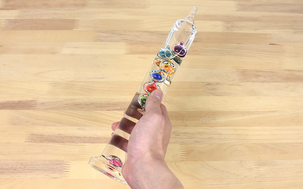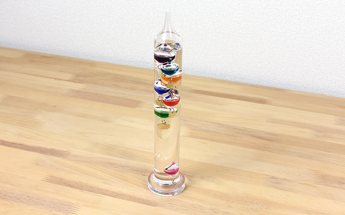 筒状の本体の中には、カラフルな液体が入った浮き子が。浮き子はそれぞれ質量と体積が異なり、温度によって上下に浮き沈みする仕様。本物のガリレオ温度計のように温度測定も可能ですが、使用条件によっては正確な温度を表示できない場合があるので気をつけてください。