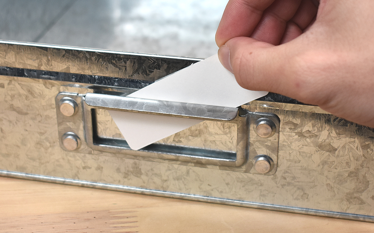 持ち手部分には付属の紙を入れられるスペースが。入れたものの名前を書いたり、ジャンルによって違う色に塗ればひと目で中身がわかります。いちいちボックスを開けて何を入れたか確認しなくていいのは助かりますね。
