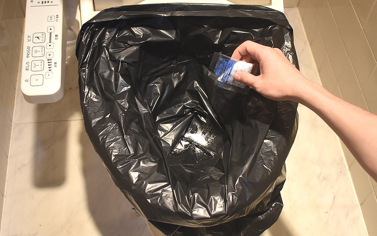 抗菌性凝固剤は抗菌作用とともに消臭効果も発揮するのがポイント。あとは排便袋の口を結んで持ち運び袋に入れればOKで、面倒と感じるほどの工程はありませんでした。
