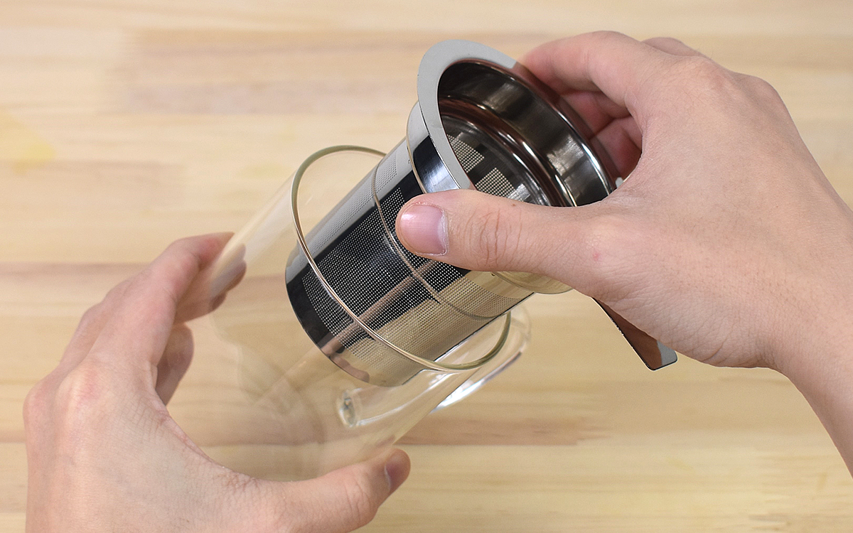 ステンレス製メッシュフィルターはカップにすっぽり収まる仕様。わざわざ自分でフィルターを持たなくても手軽にお茶を作れます。収納時もカップに入れてしまえるため、場所を取りません。