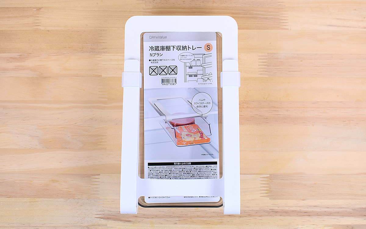 冷蔵庫の棚下に取りつけられる同商品は、大きさ約15(幅)×24(奥行)×7.2cm(高さ)。ちょうどハムやスライスチーズなどがぴったり入るサイズです。高さがさほどなく、下の物とぶつからない位置にセットできますよ。