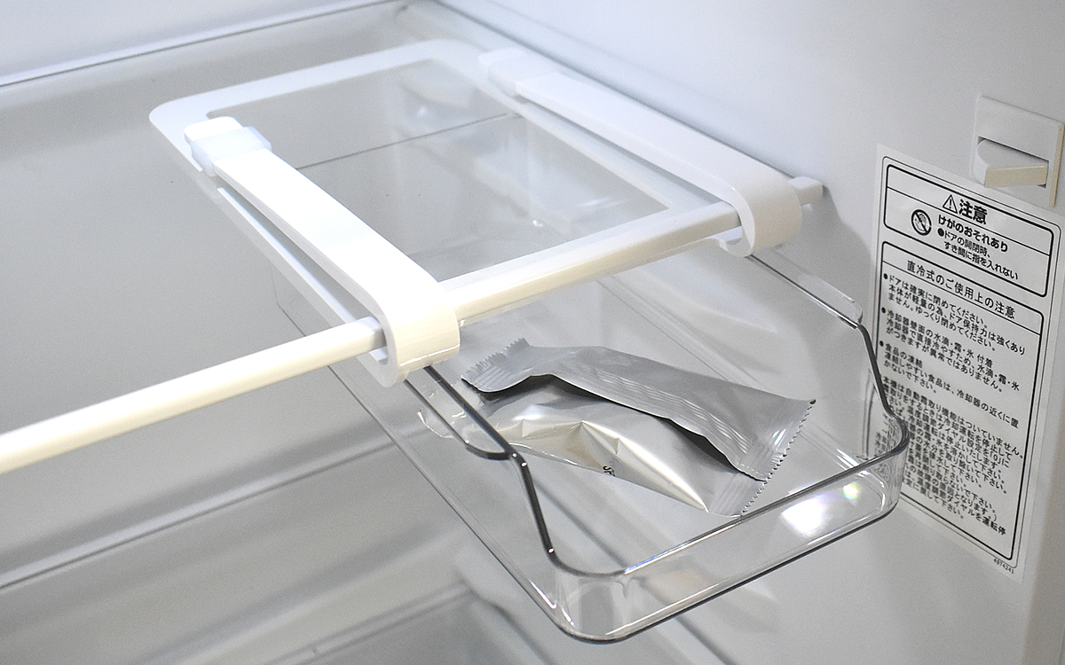 実際に冷蔵庫へ商品をセットしたところ安定感抜群。いくつか食材を入れてもトレーが落ちる気配はありません。トレーはスライドして手前に引き出せる仕様で、奥の方に入れたモノが取り出しやすいのもうれしいですね。