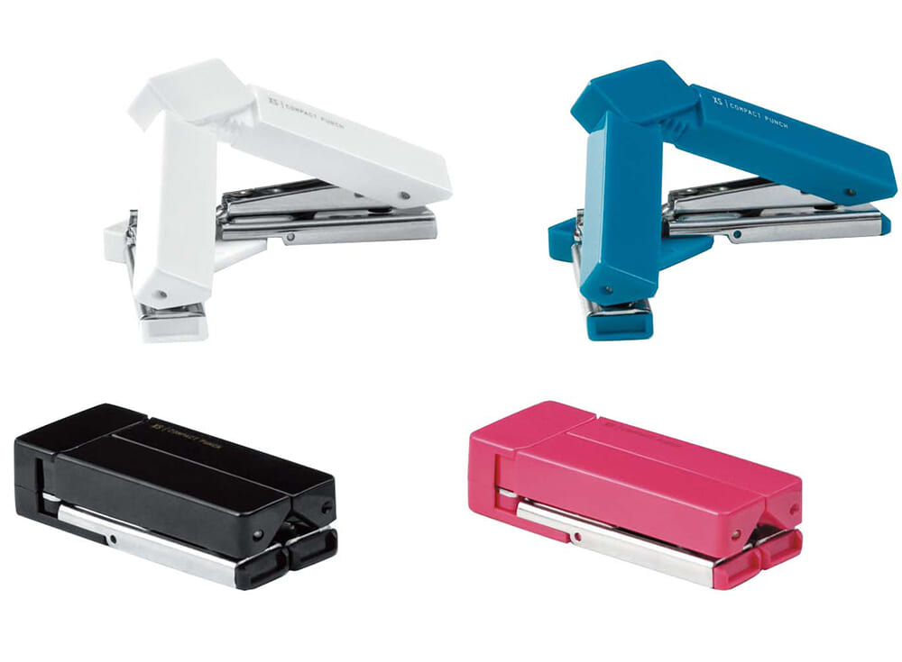 コンパクトに折り畳める世界最小クラスの二穴パンチ。左右のパーツを開くと本体が立ち上がり、一度でコピー用紙5枚まで穴開けできる。底面にはダストトレーが付いている。