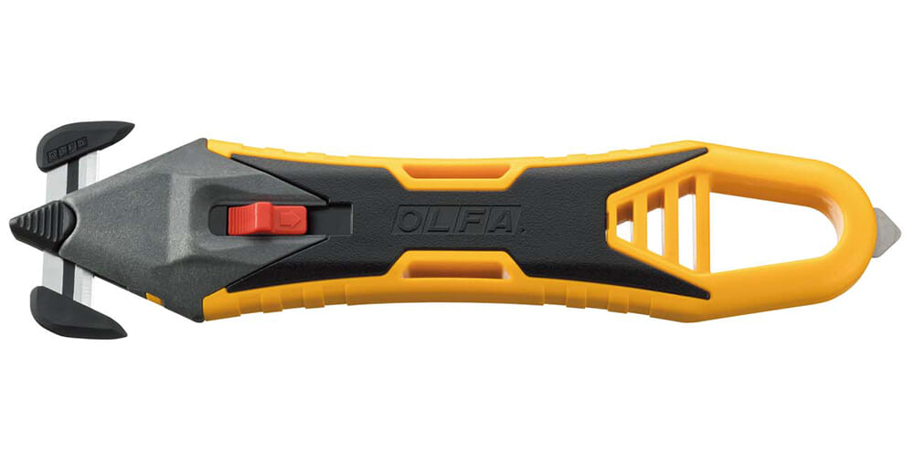 ハードな現場でも使える、頑丈で握りやすい開梱用のカッター。厚手素材を切るのに十分な刃幅ながらも、刃に手指が触れにくい安心設計だ。ワンタッチで刃を交換できる。