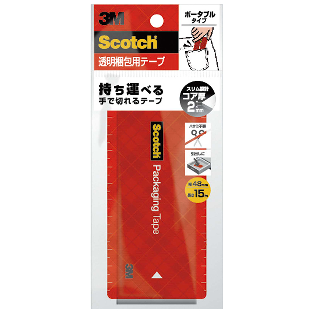 ポケットに入れて携帯しやすい、厚さ約2mmの芯を使った透明梱包用テープ。手で真っすぐに切れる特殊フィルムのためハサミは不要だ。テープを引き出すときの音も静か。