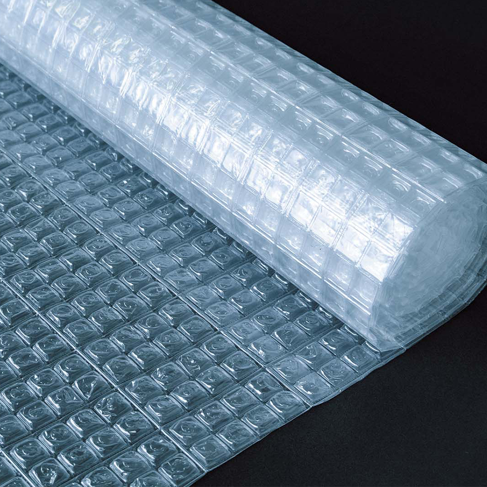 四角い形状の粒が、碁盤の目のように並んだ緩衝材。手で切り込みを入れるだけで真っすぐにカットでき、ハサミなしで梱包作業を行える。耐水性、耐薬品性のあるポリエチレン素材だ。