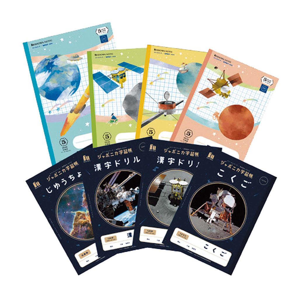 表紙写真の解説や読み物付録が付いたロングセラー学習帳の、JAXA監修協力商品。「天の川の正体」や「ロケット打ち上げの仕組み」など、宇宙の謎に迫る知識が詰まった全18種展開。