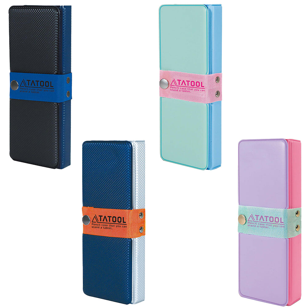 タブレットを立てられるスタンド付きの筆箱。細めから太めの鉛筆が入る鉛筆ホルダーと、スタイラスペンや名前ペン、定規類が入る収納部、消しゴム用のスペースがあり、抜群の収納力だ。
