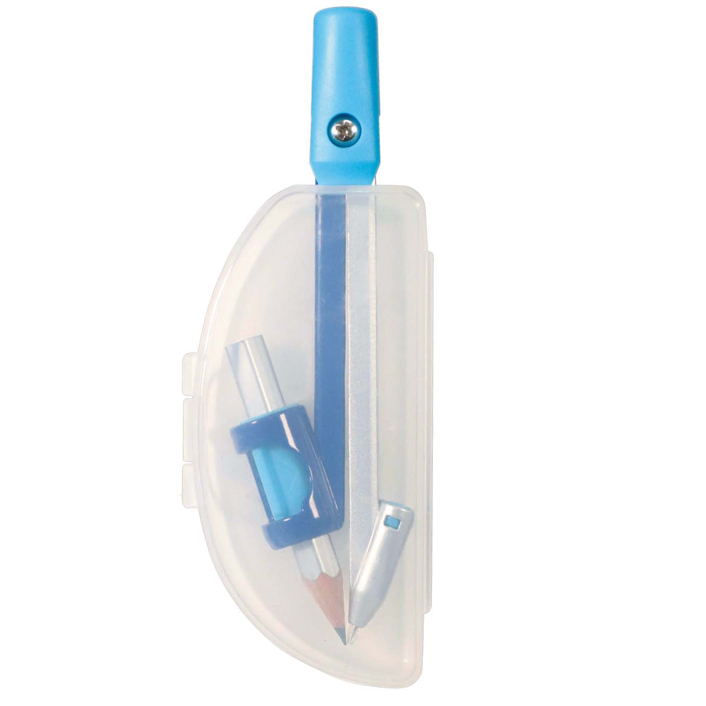 円を描くときだけ針が出る、安全設計のコンパス。ヘッド部分は人間工学に基づいた設計で、軸がブレず回しやすい。ホルダーは、スライドするだけで鉛筆を固定する。一体型のため紛失しにくい。