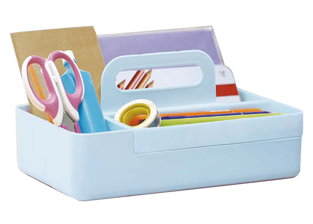 勉強セットや工作道具などをまとめるのに活躍。筆記具を入れるのにちょうど良い浅めのトレイ付きで、マグネットで取り外しできる。入れるモノの名前が書ける「場所決めシール」付き。