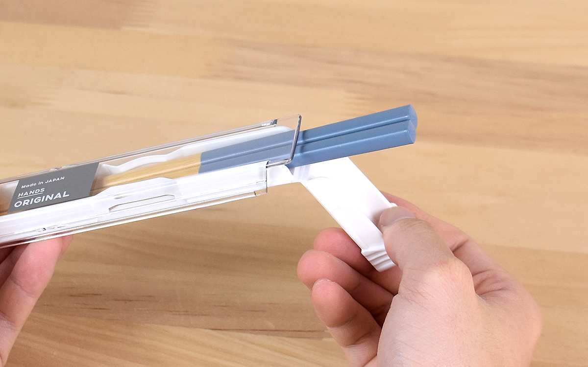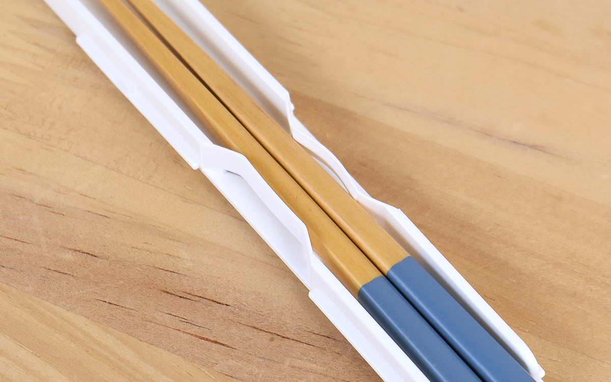 箸入れの中央部分にはズレ防止設計が施されており、動いてもカチャカチャ音がならない仕様。さらにケースの先端部分を折り曲げられ、フタを完全に開けきらなくてもスっと箸を取り出せます。フタは全部スライドさせることも可能なので、分解してお手入れしたい人も安心してください。