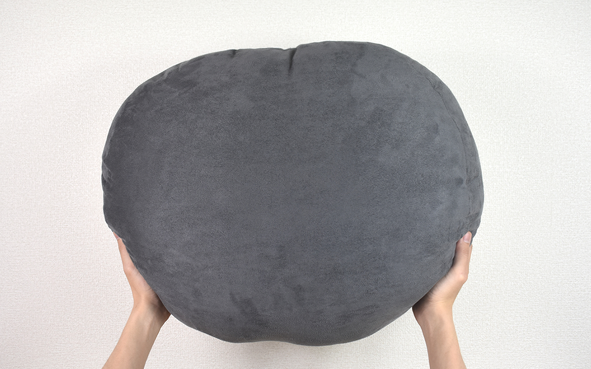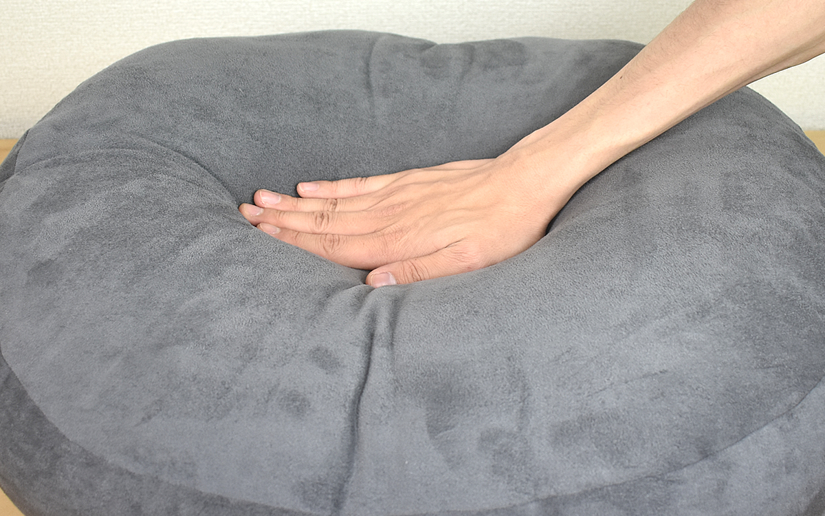 思わず撫でたくなる側生地の心地よさもさることながら、商品を手にして「これはたまらない…」と感動したのがクッションのやわらかさ。生地の中に詰められているのはポリエステル(100%)で、重ねた手が容易に深々と沈みこんだほどです。