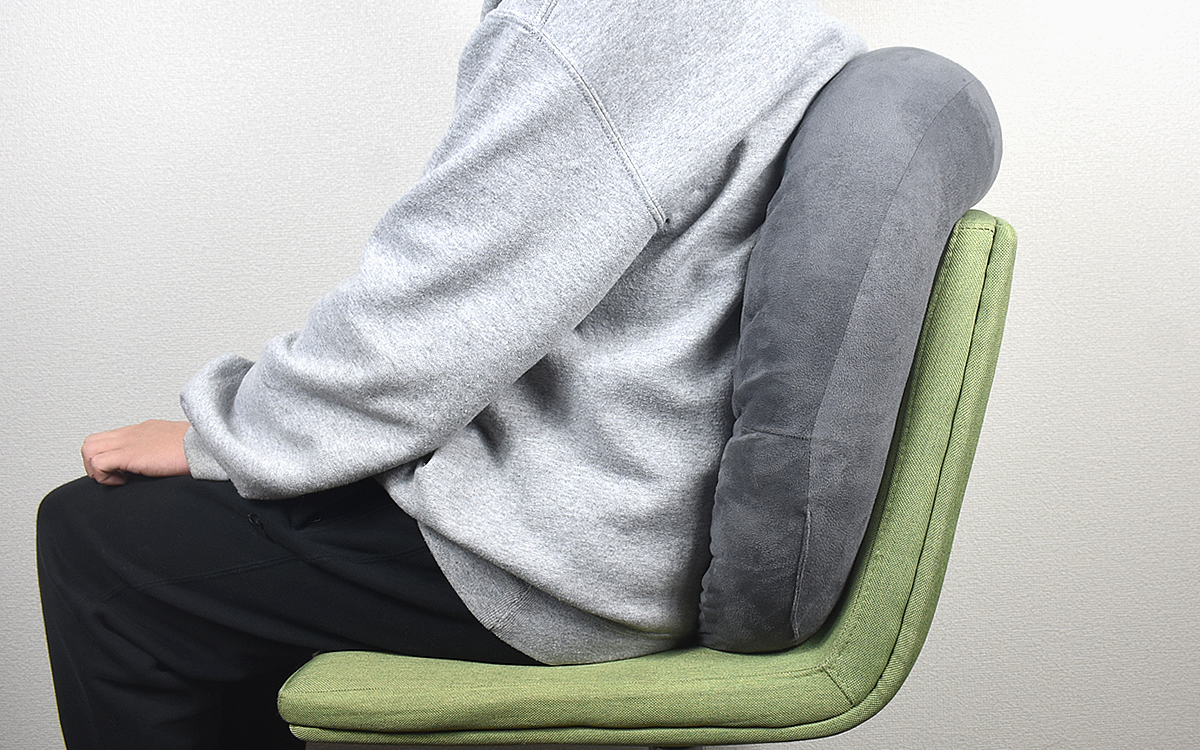 クッションの真価を確かめるべく、背当てとして使ってみたところが下の画像。クッションを縦向きに置いたところ、背中から腰にかけて広い範囲を優しく受け止めてくれました。また横向きに使用すると生地が横からはみ出し、肘をそっと支えるかたちに。なお抱き心地も抜群なので、ちょっと疲れた時に抱き寄せると心身共にリラックスできるのではないでしょうか。