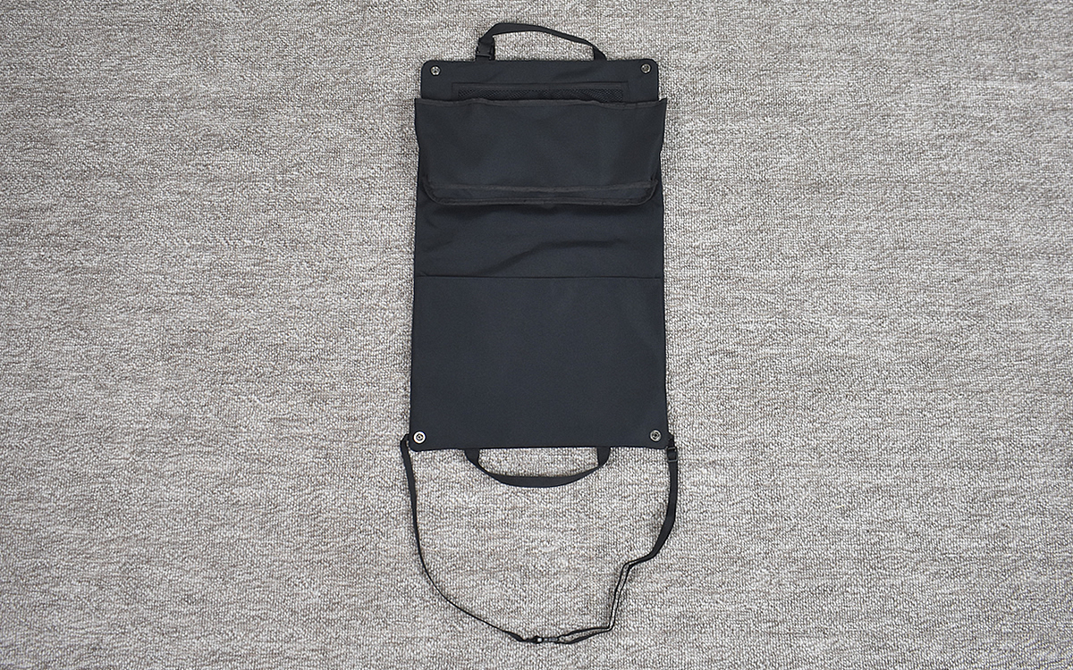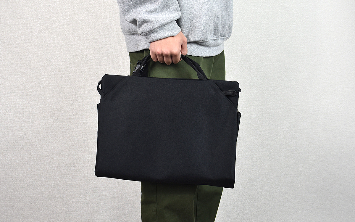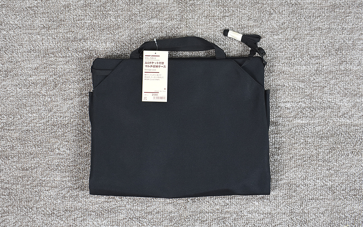 さらに驚かされるのが、収納ケースの半分近くを占めるA4ポケットの収納力。ご覧のとおりノートパソコンやタブレットがすっぽり入り、収納ケースを折りたたむとビジネスバッグのように手に提げることもできました。
