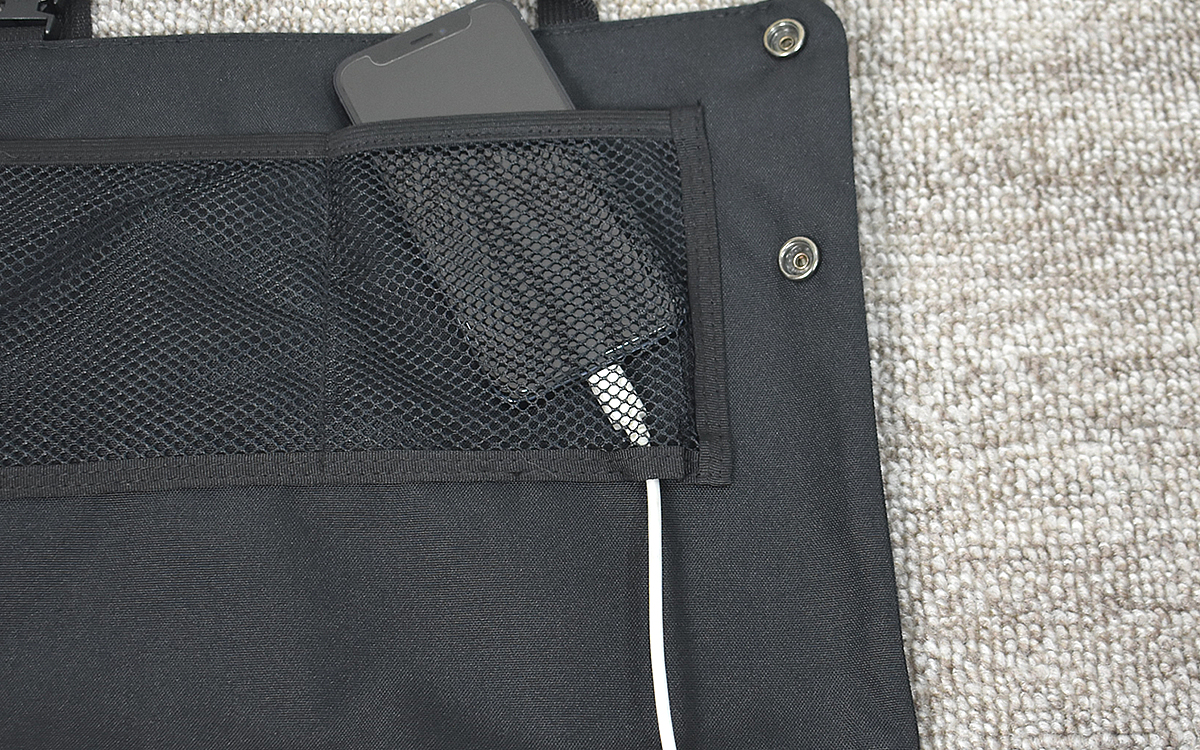 メッシュポケットを使用してみて「これは便利」と感じたのは、右下にコード穴が開いていること。これならコードが手元でごちゃごちゃになることなく、スマホをメッシュポケットに入れたまま充電することができます。