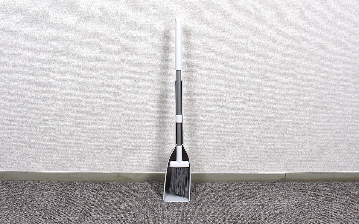 保管時はちりとり内にほうきをはめ込んだ状態でしまえる同商品。ほうきをセットした場合の大きさはおよそ8.6(幅)×12.2cm(奥行)とかなりスリムです。ほうきの柄は約53~77cmに長さ調整可能。あまり高さがない収納スペースでも突っかからずに置けて助かりますね。