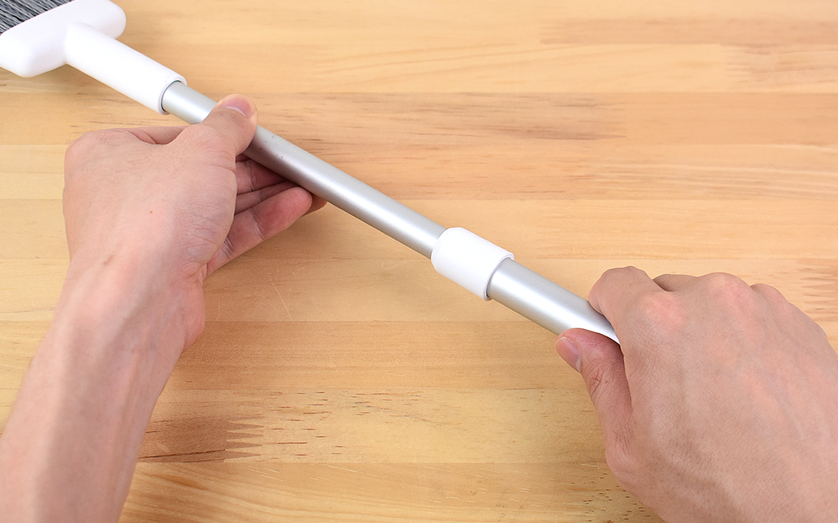 長さ調整する時は、柄を少し回転させて上下するだけ。ほんの数秒で自分好みの長さに変身します。最長の77cmまで伸ばすとかなり遠くの方まで掃除可能に。棚同士の隙間など掃除機では入りこめない場所に使うのもオススメですよ。