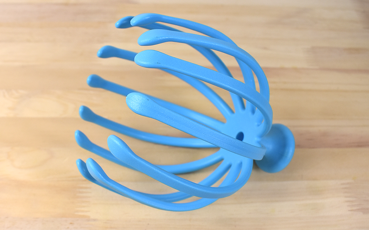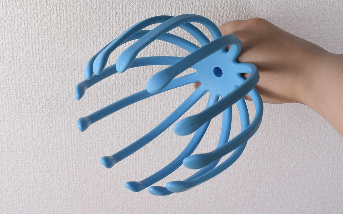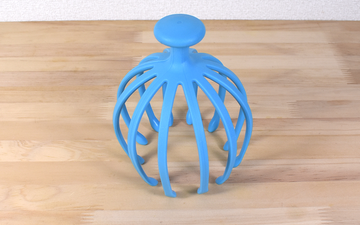 まるでタコのような見た目の同商品。合計12本の“足”が円を描くように並び、先端は指の腹のようにぷっくり膨らんでいます。頭皮マッサージ用のアイテムといえば金属製で足の細いものをイメージしがちですが、「ツボヘッド ストロング」はその名に相応しいがっしりした構造が印象的。