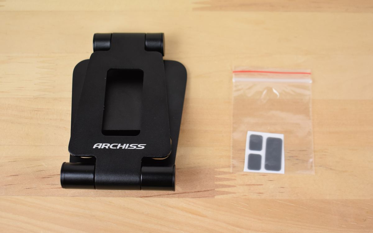 パッケージに入っていたのは、コンパクトに折りたたまれたスタンド本体と付属のクッションシート。たたんだ状態のスタンドは約7.3(幅)×10.3(奥行)×2.3cm(高さ)と手のひらにすっぽり収まるサイズなので、ビジネスバッグに入れておいてもかさばることはありません。