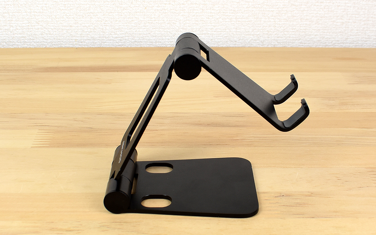 スタンドは背もたれと台座部分に角度調整ができる軸を備えていて、実際に動かしてみるとどちらも調整に少し力を加える必要が。とはいえ1度好みの角度にしたらそのまましっかり固定され、スマホを置いてもストレスなく使用できるのがGOODです。