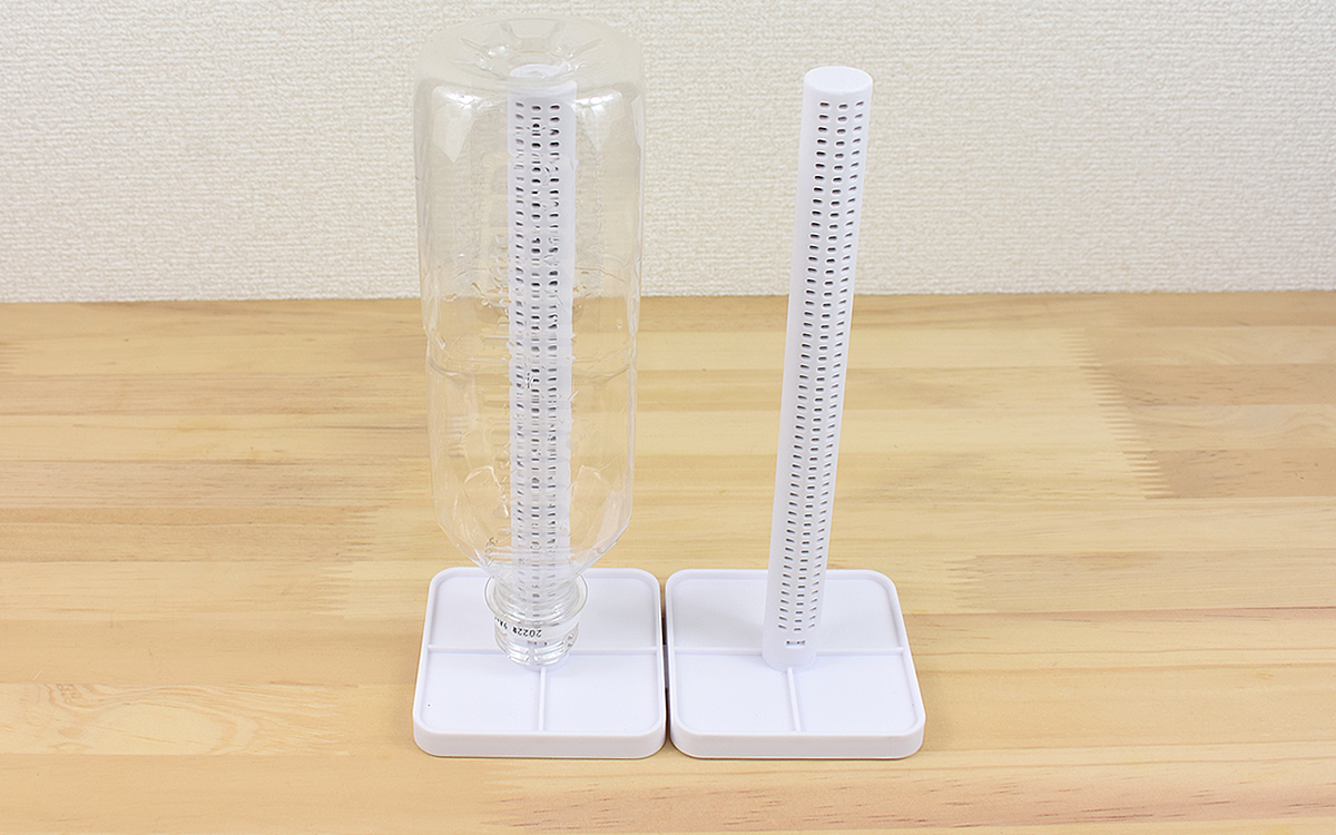 組み立てが完了したら、まずはペットボトルを乾かしてみることに。ちょうど500mlペットボトルにピッタリのサイズ感で、小さい飲み口でも難なく入れることができました。しばらく置いておくと、内側の水分がなくなり徐々に乾いていく様子がわかります。