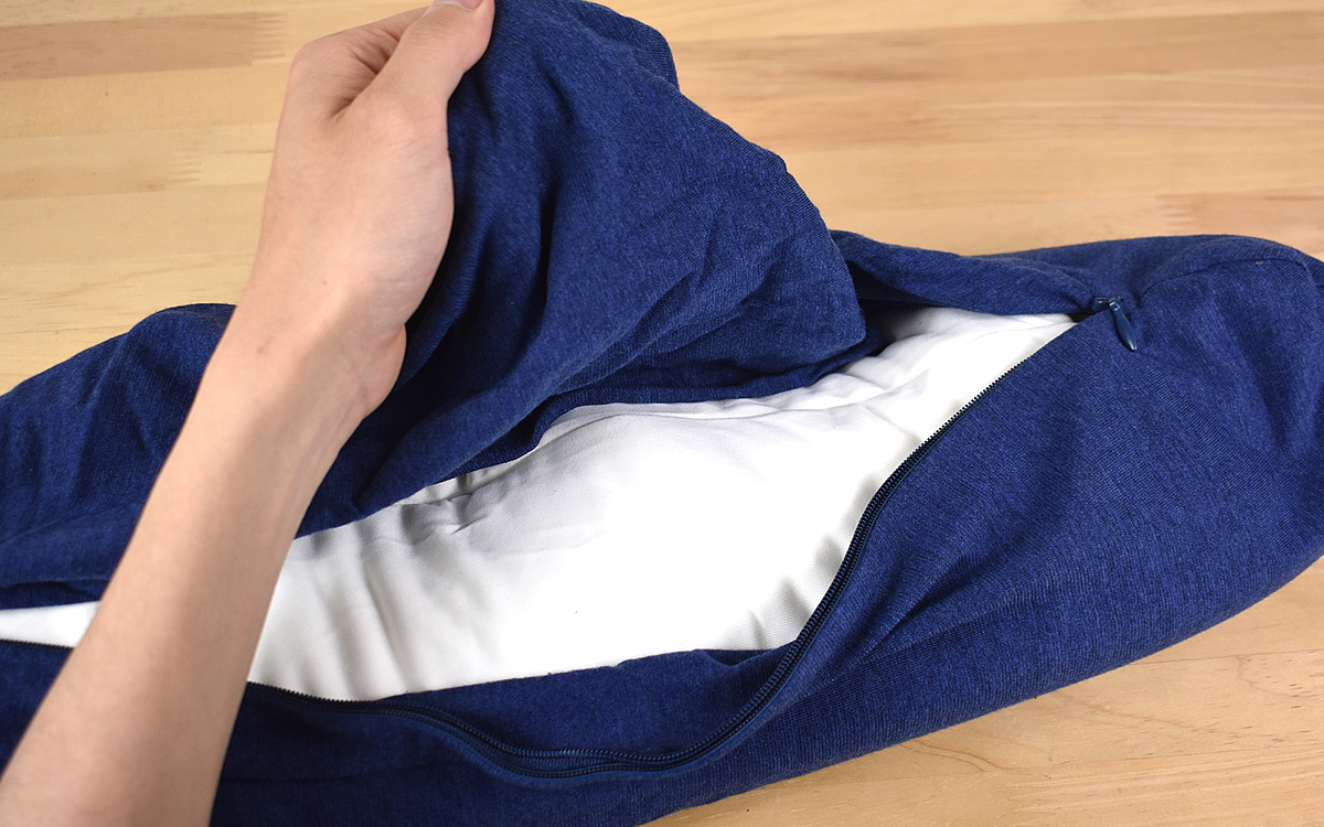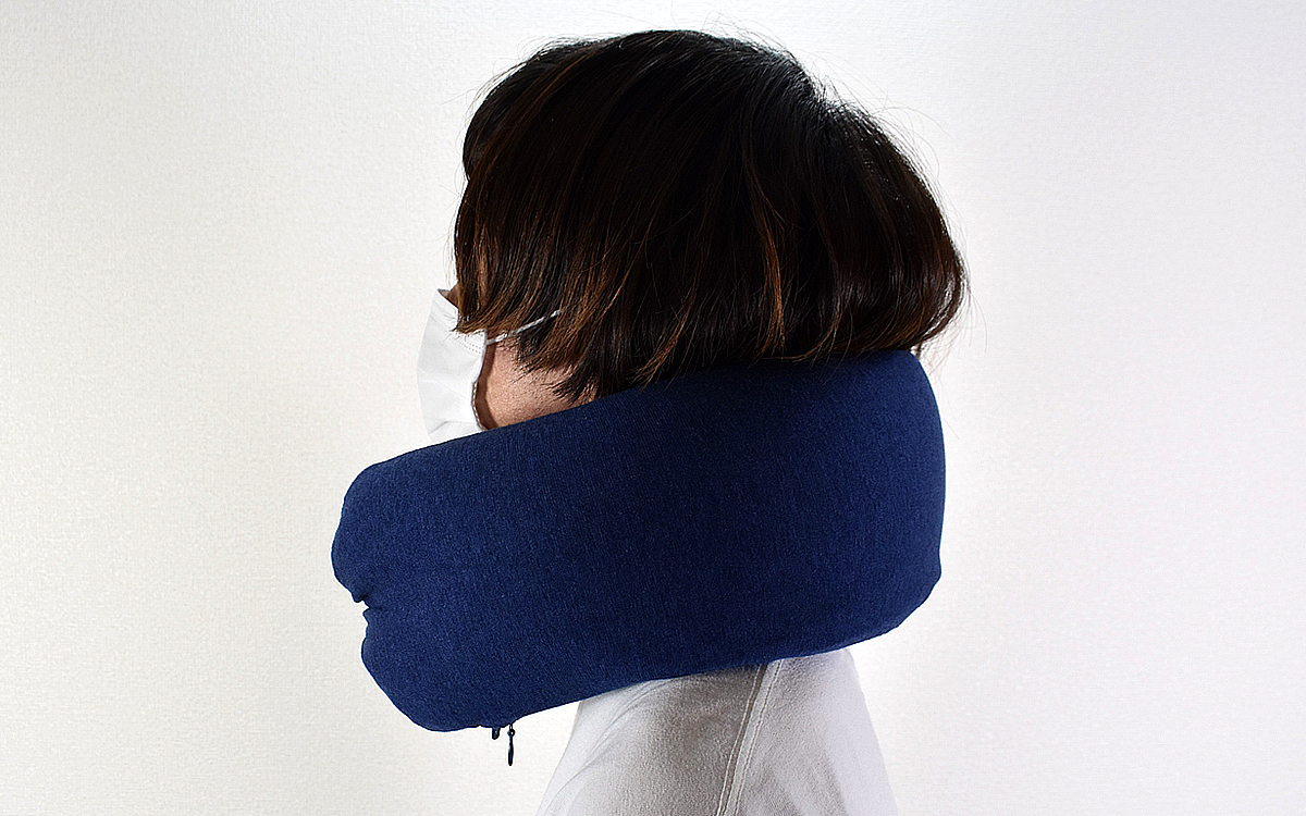 杢ネイビー色の同商品は、さらりとした手触りで暑苦しさを感じません。中にはポリスチレンの発泡ビーズが入っており、クッション性も問題ナシ。さっそく首にセットしてみたところ、“柔らかい生地”と“弾力性のある発泡ビーズ”のおかげで着け心地は抜群でした。