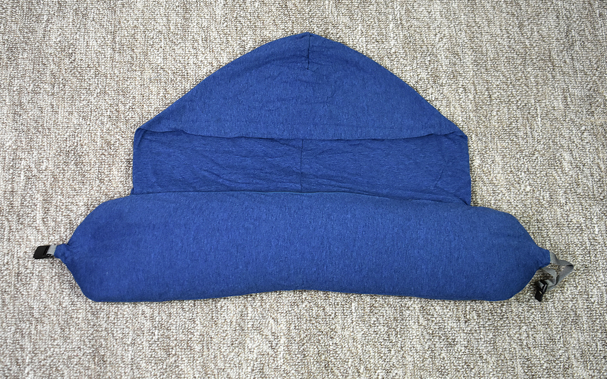 さらに同商品ならではの“フード”も試してみることに。思っていたよりもだいぶ大きめで、顔の上半分はすっぽり隠れるほどのサイズ感。布自体はそこまで分厚くないものの、遮光性はバッチリでした。ちなみに普段使わない時は、カバーの中に収納しておけるのもうれしいポイント。フードの出し入れもスムーズにおこなえるので、安心してくださいね。