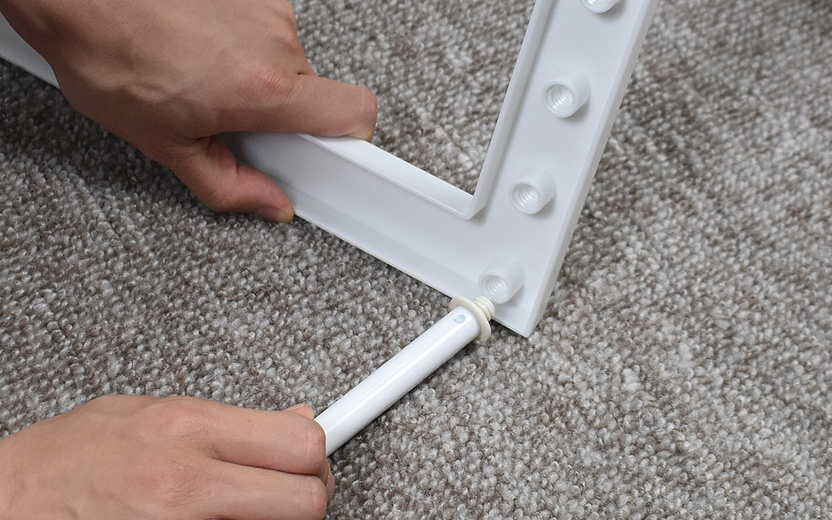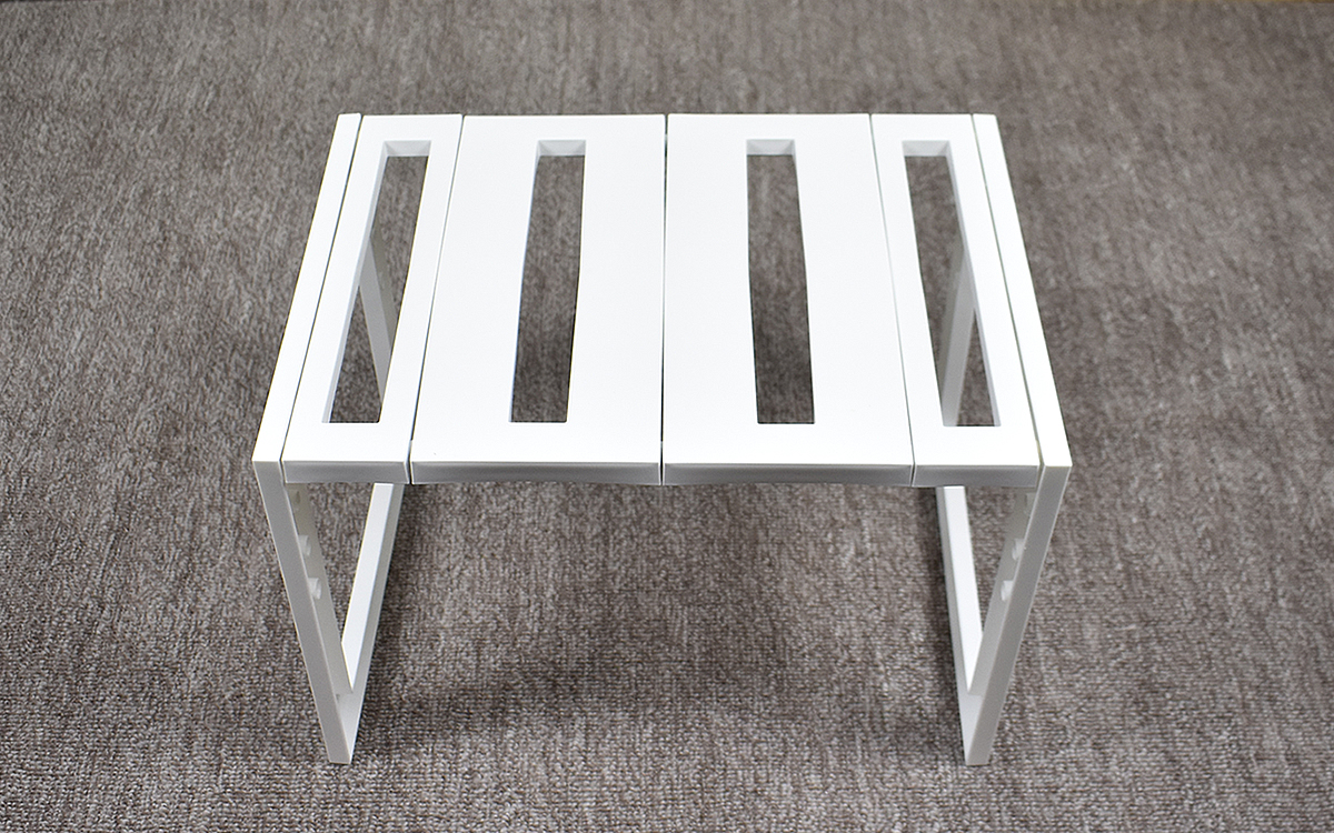 商品サイズは、およそ45(幅)×32(奥行)×31cm(高さ)ほど。幅に関しては29~45cm程度まで伸縮可能なうえ、棚の位置も4段階に調節できます。一方耐荷重は約5kg。組み立ての際に工具などは必要ありません。実際に自分でラックを組み立ててみたところ、伸縮パイプ(計2本)と棚板をフレームに取りつけるだけなのであっという間に完成しました。